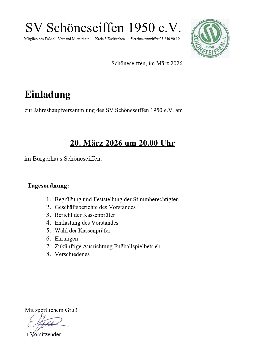 als Anlage die Einladung zu unserer Jahreshauptversammlung am 20. März 2026 um 20.00 Uhr im Bürgerhaus Schöneseiffen.
